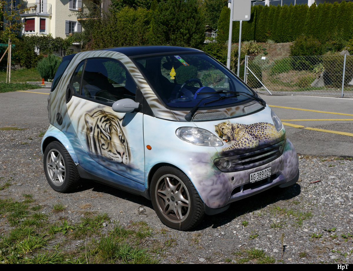 Grauer Smart mit Werbung in Yverdon am 21.05.2025