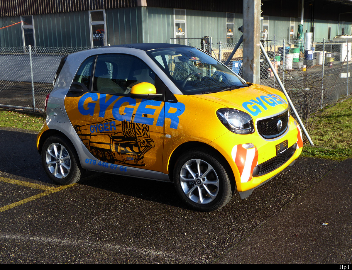 Grauer Smart mit Werbung in Yverdon am 21.05.2025