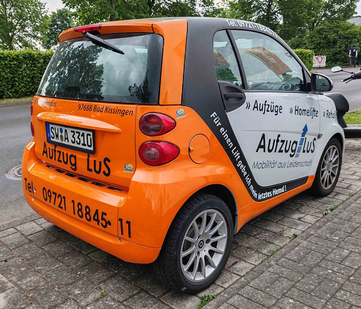 =Smart von AUFZUG-LuS, abgestellt auf dem Parkplatz der RettMobil im Mai 2024