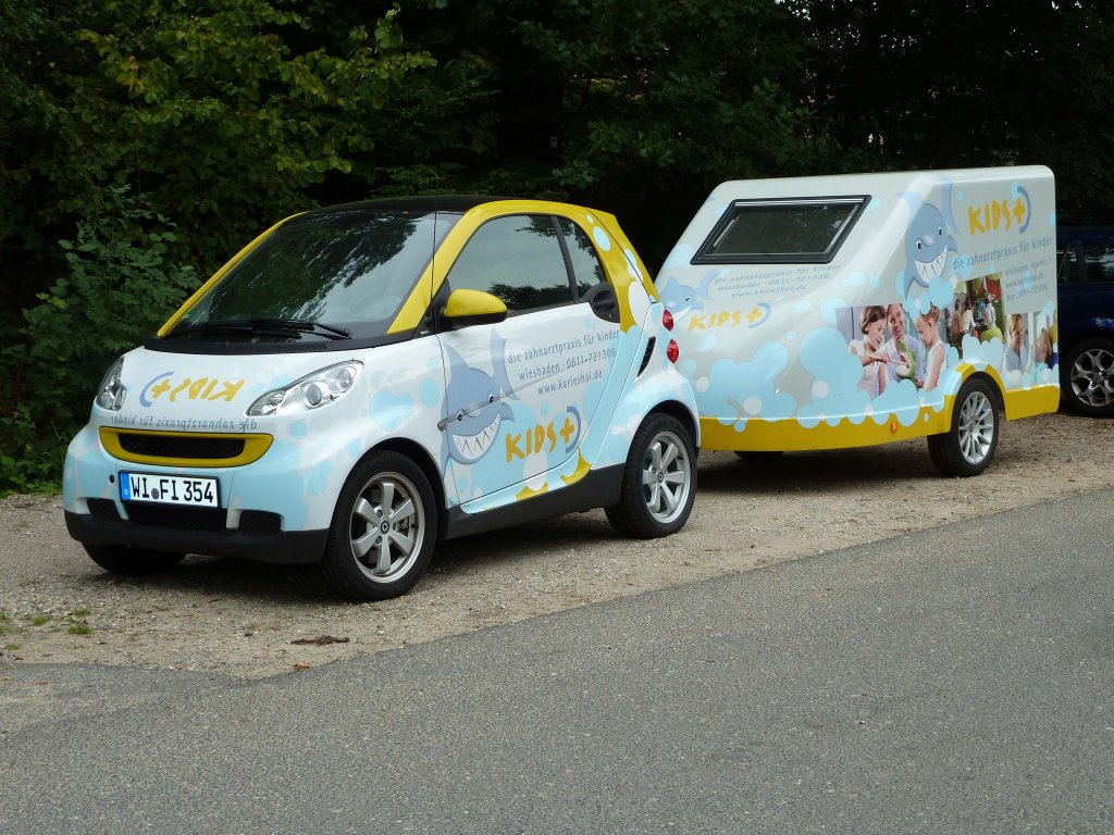Smart mit Anhänger als Werbeträger für einen Kinderzahnarzt steht an der Fasanerie in Wiesbaden, September 2011