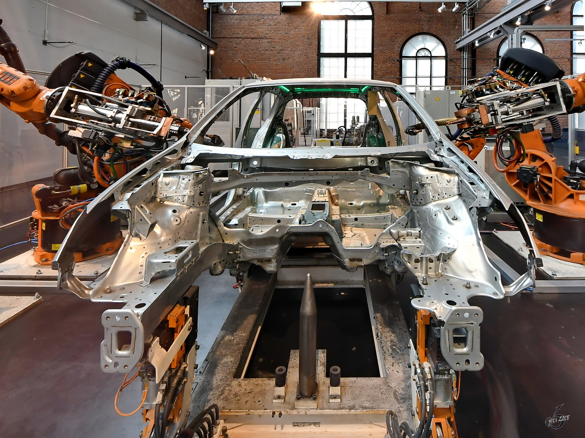 Ein VW Golf 6 entsteht, zumindest simuliert. (Sächsisches Industriemuseum Chemnitz, August 2018)