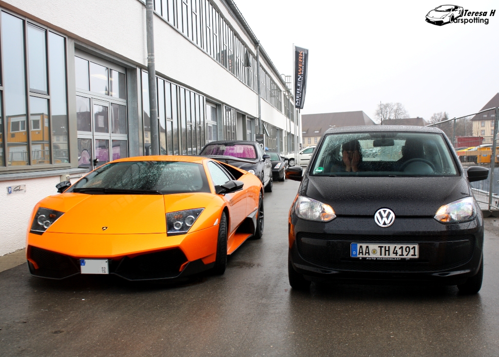 Mein neuer VW up! neben einem Lamborghini Murcielago LP670 SV in Böblingen am 17.2.2012