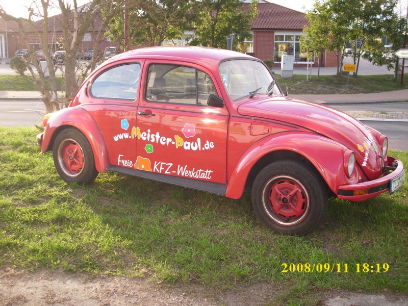 Für eine KFZ-Werkstatt wirbt dieser VW Käfer.Aufgenommen am 11.09.2008 in Bergen/Rügen.