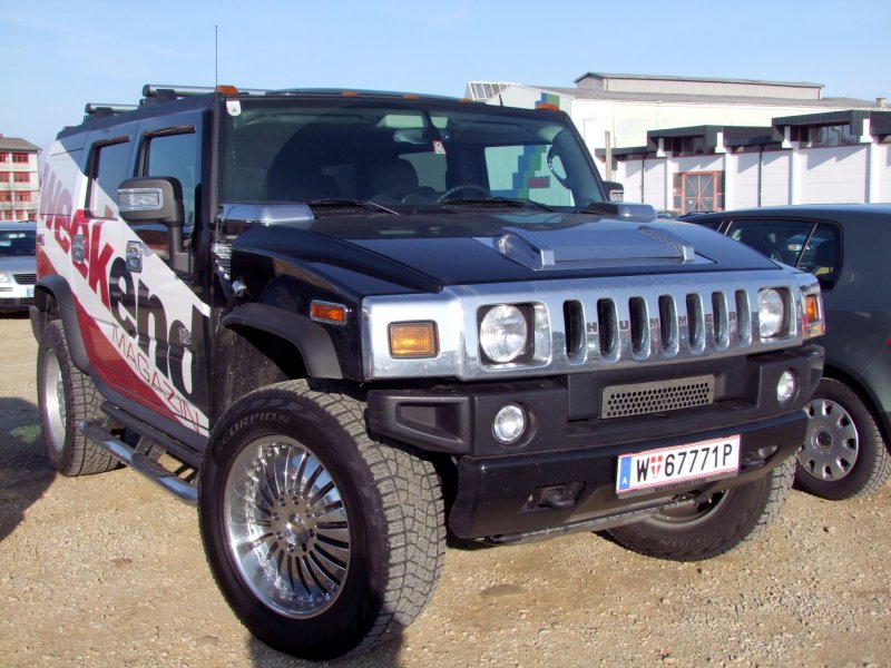 HUMMER mit der Aufschrift eines Wochenendmagazins steht am Messegelände in Ried i.I.; 081109