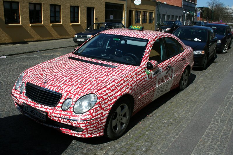 Ein Taxi mit einer orginellen Werbung für einen dänischen Radiosender. Odense am 20.04.2008.