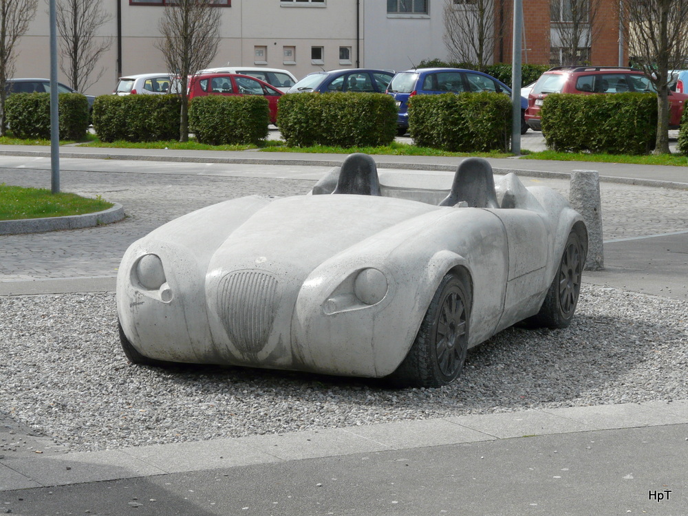 Nachbildung eines Oldtimer aus Stein auf dem Bahnhofsplatz in Flüelen am 09.04.2012