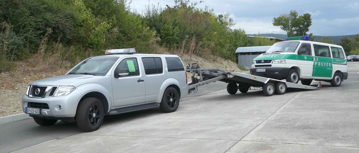 =Nissan Pathfinder, VW T4 und Transportanhänger der Bundespolizei zeigen die Bergung eines liegengebliebenen Dienstfahrzeuges, gesehen beim Tag der offenen Tür anl. 60 Jahre Bundespolizei Standort Hünfeld im September 2019