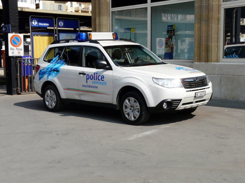 Police Cantonale Neuchâteloise - Polizeiauto Subaru FORESTER NE 64574 vor dem Bahnhof in Neuchâtel am 04.04.2009