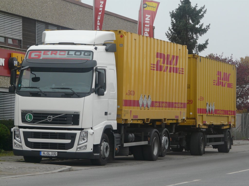 Volvo FH 420 Hängerzug "Gerolog" mit DHL-Wechselbrücken im Nürnberger Hafengebiet, 01.11.2011