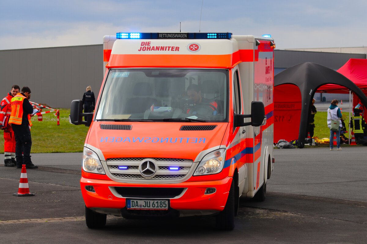 Die Johanniter Mercedes Benz Sprinter RTW bei einer Großübung am Flugplatz Egelsbach am 20.04.24. Dieses Foto ist per Teleobjektiv entstanden da man nicht auf dem Übungsgelände Fotos machen durfte