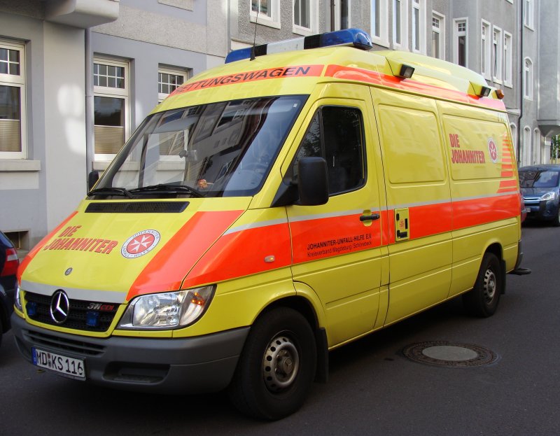 MB Sprinter RTW der Johanniter bei einem Einsatz in Magdeburg Stadtfeld in der Nähe des Schellheimerplatzes. Fotografiert am 15.08.2009.