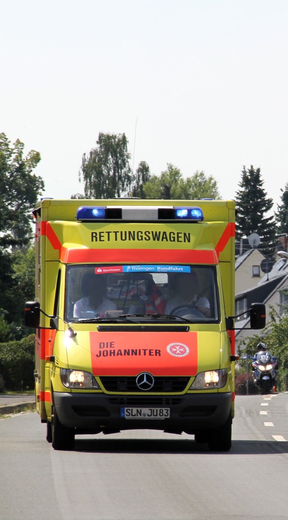 RTW Johanniter im Einsatz der Thüringen - Rundfahrt in Zeulenroda. Foto 20.07.13