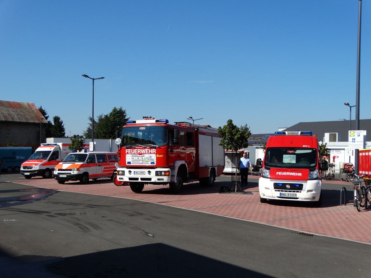Feuerwehr Maintal FIAT Daily MTW2 (Florian Maintal 2-19-1), MAN LF 16 CAFS (Florian Maintal 2-44-1), Deutsches Rotes Kreuz Ortsverband Maintal VW T4 (RK Main-Kinzig 19-19-2) und Mercedes Benz Sprinter RTW (RK Main Kinzig 19-85-1) am 25.09.16 beim Tag der Offenen Tür in Bischofsheim