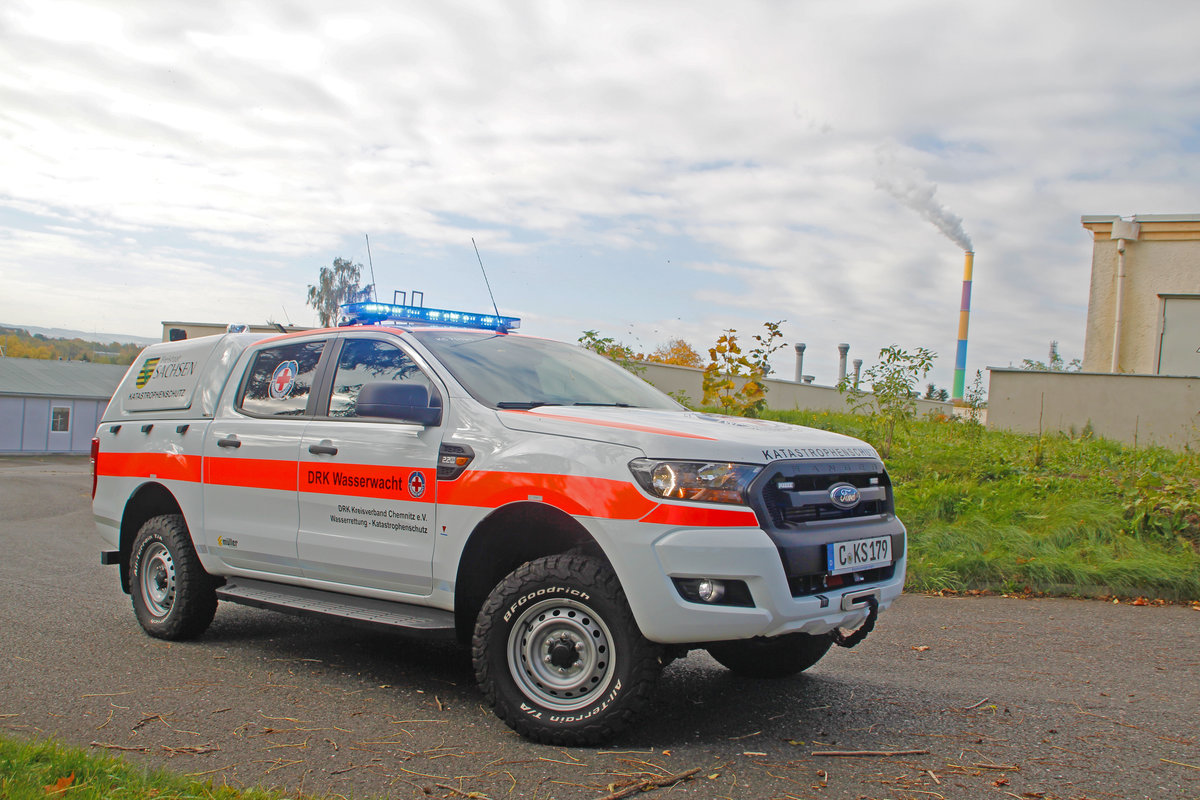 neuer Mannschaftstransportwagen MTW der Wasserrettungsgruppe der DRK Wasserwacht Chemnitz auf Ford Ranger XL mit Ausbau der Sachsengarage fotographiert am 14.10.2017. Im Hintergrund ist der bunte Schornstein des Heizkraftwerk Nord zu sehen.