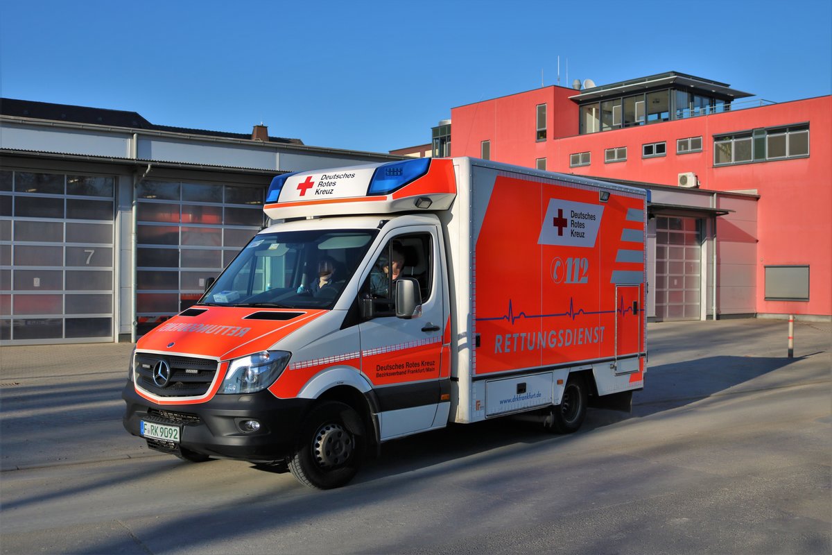 DRK Frankfurt Mercedes Benz Sprinter RTW am 16.02.19 im Osthafen an der Wache 40