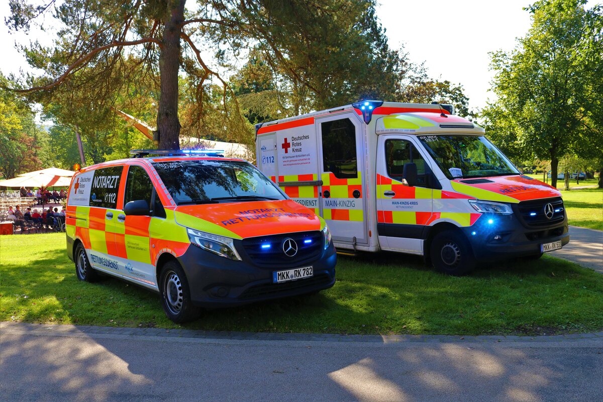 DRK KV Gelnhausen Schlüchtern Mercedes Benz Vito NEF (RK MKK 2/82-1) und Mercedes Benz Sprinter RTW (RK MKK 1/83-1) bei der Polizeischau im Kurpark Bad Soden Salmünster am 16.09.23. Danke an das Team für das Einschalten des Blaulichts