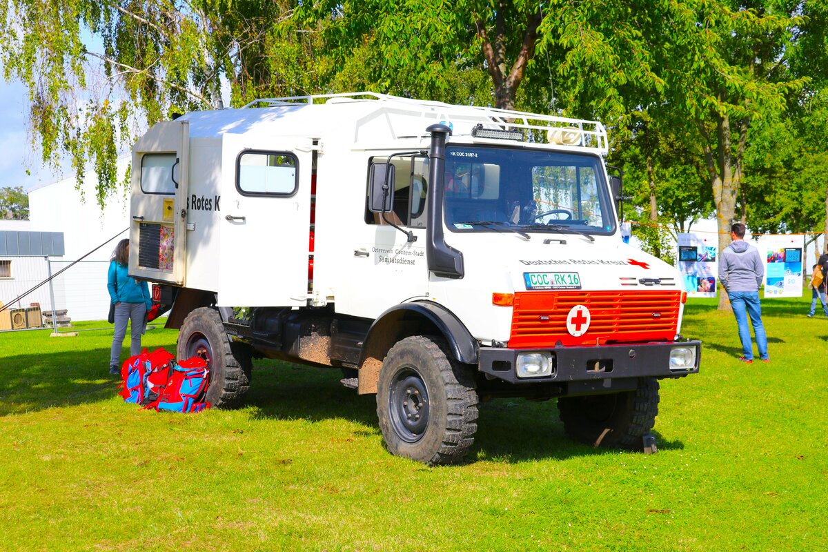 DRK Mercedes Benz Unimog 1300 am 23.09.23 beim Tag der offenen Tür von Christoph 23 zum 50 jährigen Jubiläum