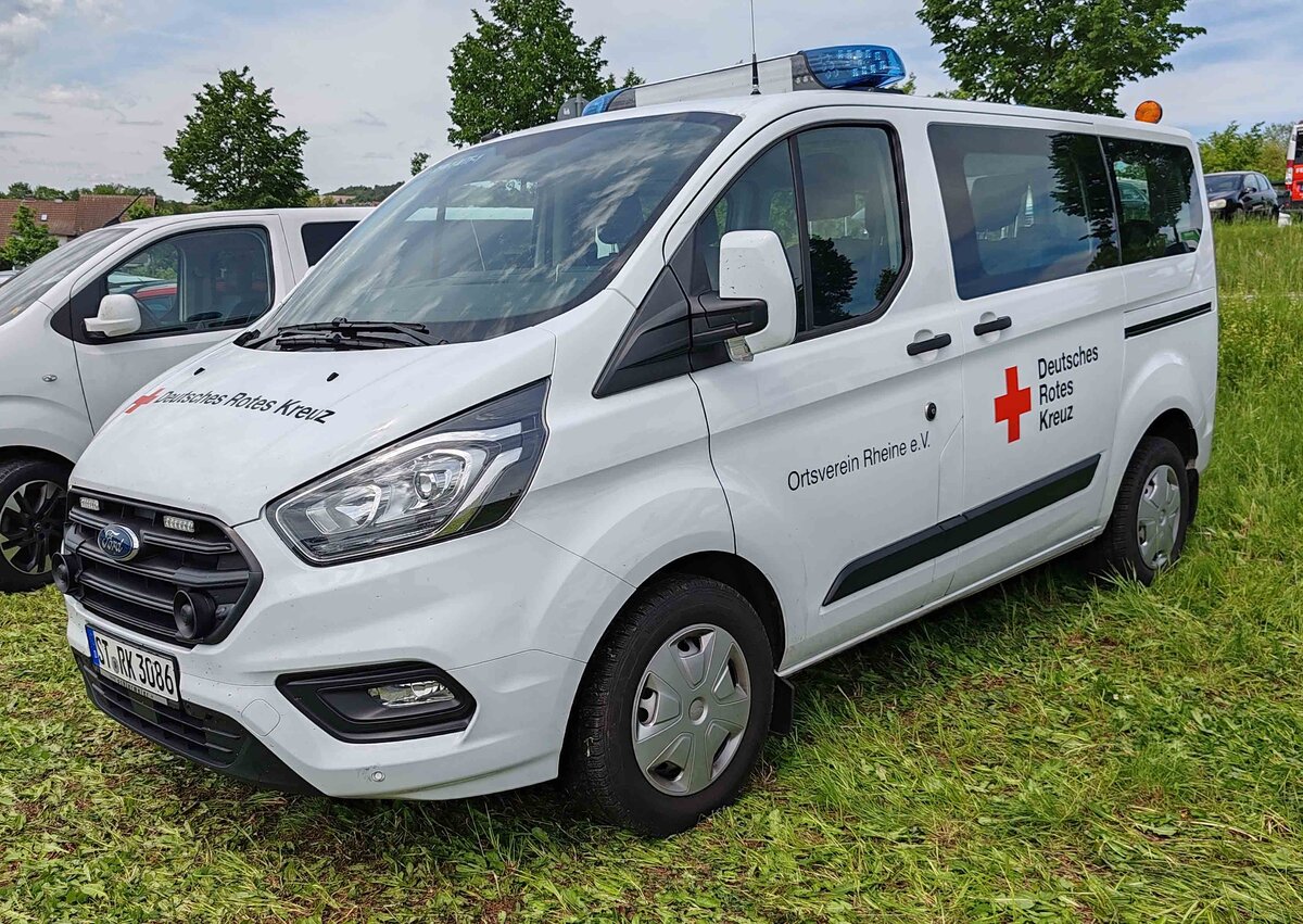 =Ford Transit Custom des DRK OV RHEINE steht im Mai 2024 auf dem Besucherparkplatz der RettMobil in Fulda