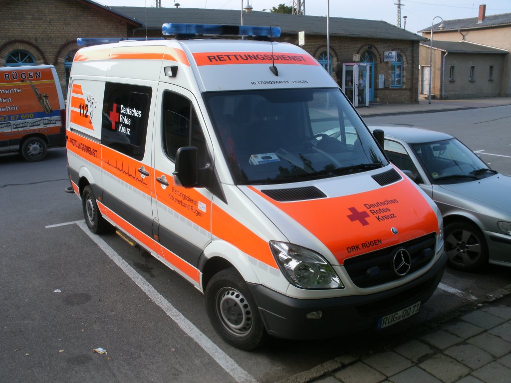 Als ich diesen Mercedes-Krankenwagen,am 24.August 2011,vor dem Bahnhof in Bergen/Rügen fotografierte hatte dieser mal keinen Einsatz,denn am Bahnhof befindet sich eine Dönnerbude.