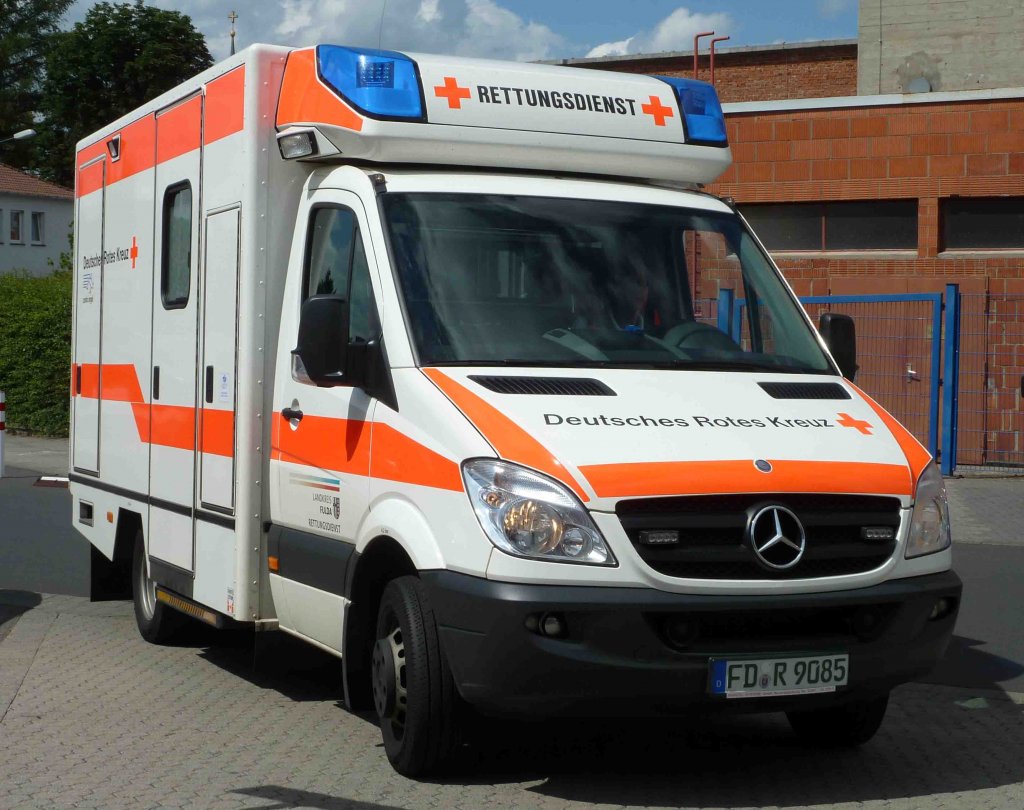 MB Sprinter des DRK-Kreisverbandes Fulda steht am DriveInn des Mediamarktes in Fulda, Juni 2012