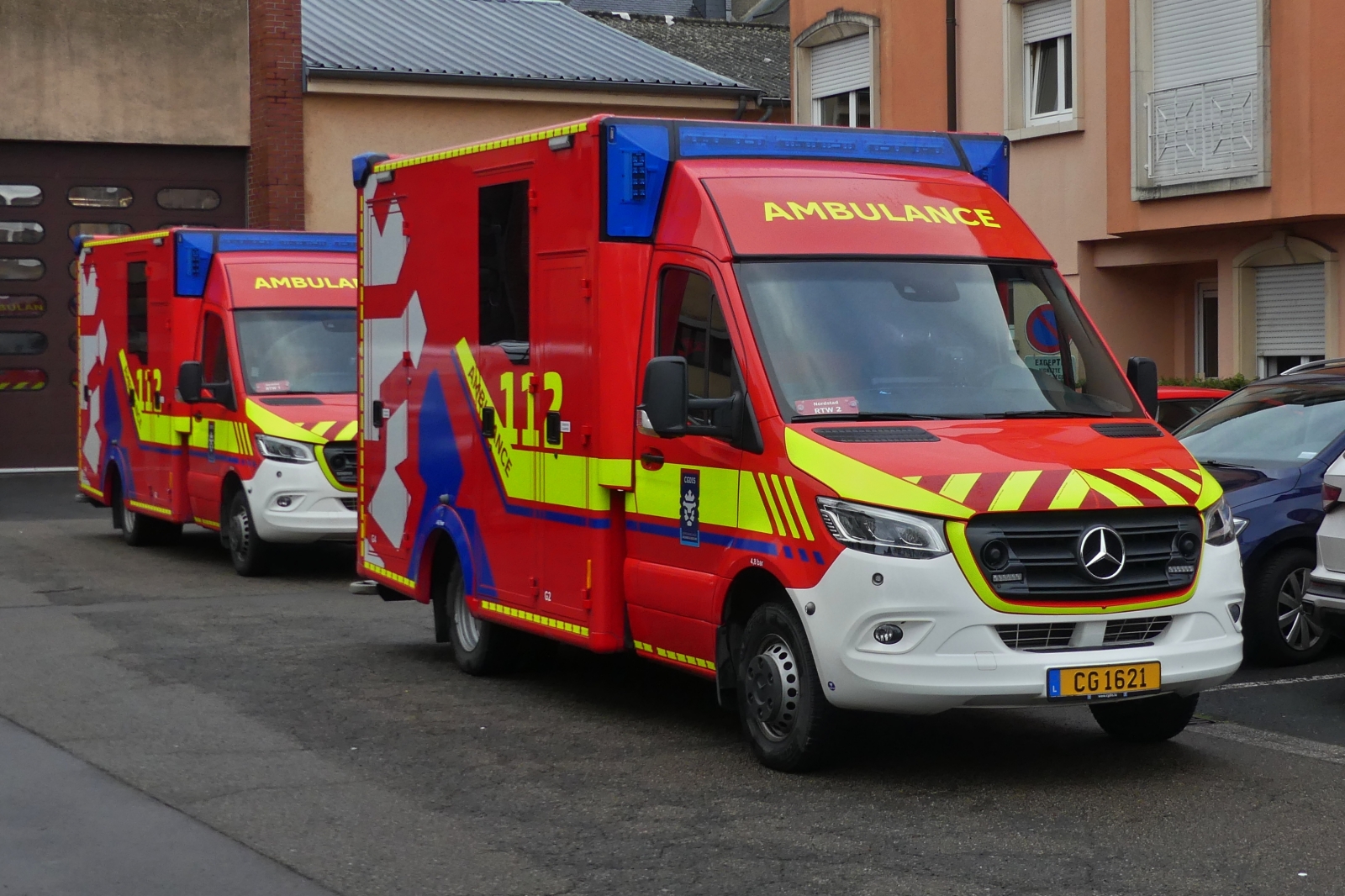 Mercedes Benz Krankenwagen stehen vor der Feuerwache in Ettelbrück.