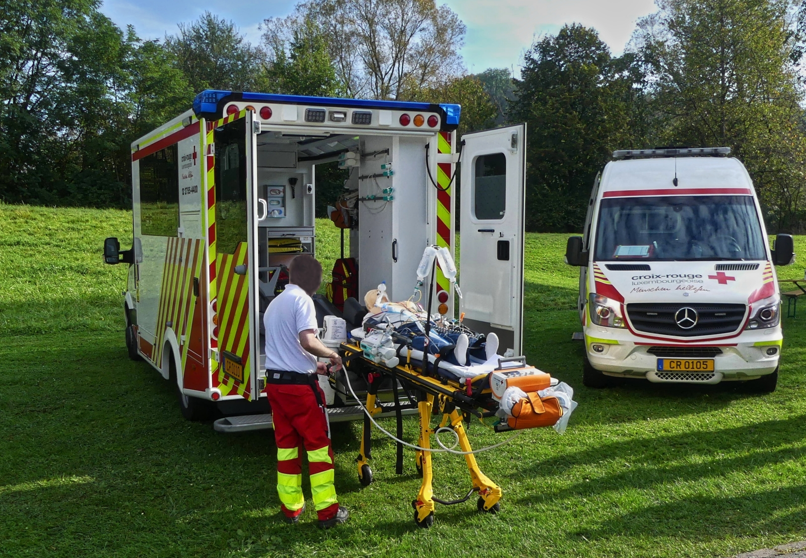 Mercedes Benz Sprinter, des luxemburgischen Roten Kreutz ist zum Tag der Rettungsdienste in Echternach angereist, bei dem Krankenwagen daneben wird an einer Puppe vorgeführt, wie ein Patient versorgt wird, bevor er in den Krankenwagen aufgenommen wird. 22.09.2024