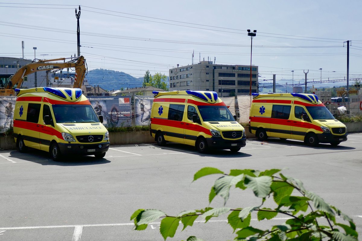 3 Sprinter Ambulanzen die wärend der Tag der offenen Tür bei der Sanitätspolizei Bern vor dem Depot parkiert waren.