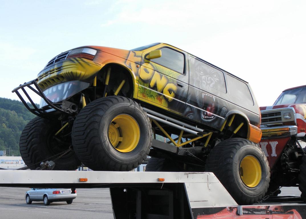 Monstertruck mit der Karosserie eines Chrysler Voyager, aufgenommen am 18.06.2013 in Trier