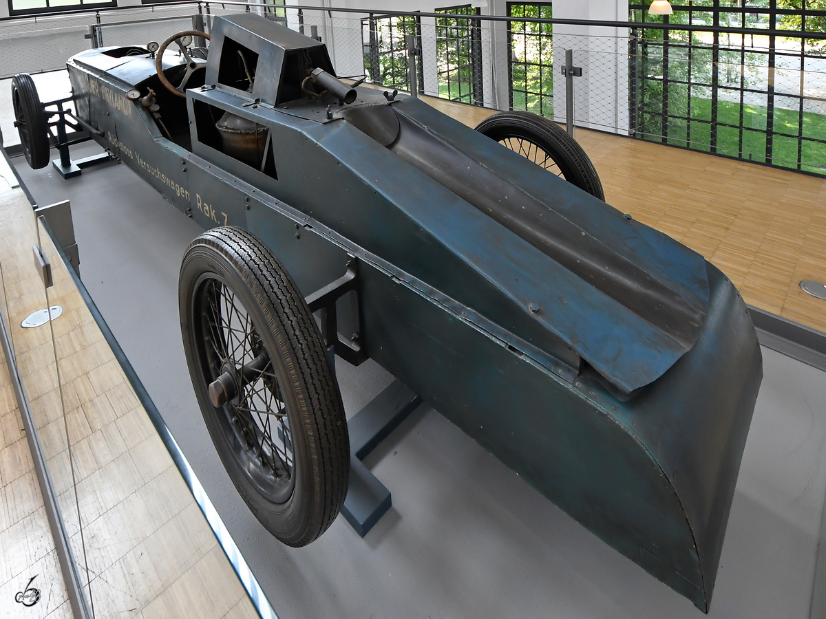 Der Valier-Heylandt Rückstoßversuchswagen Rak7 aus dem Jahr 1930 hatte einen der ersten Flüssigkeits-Raketenmotore und wurde mit Alkohol und flüssigem Sauerstoff betrieben. (Verkehrszentrum des Deutschen Museums München, August 2020)