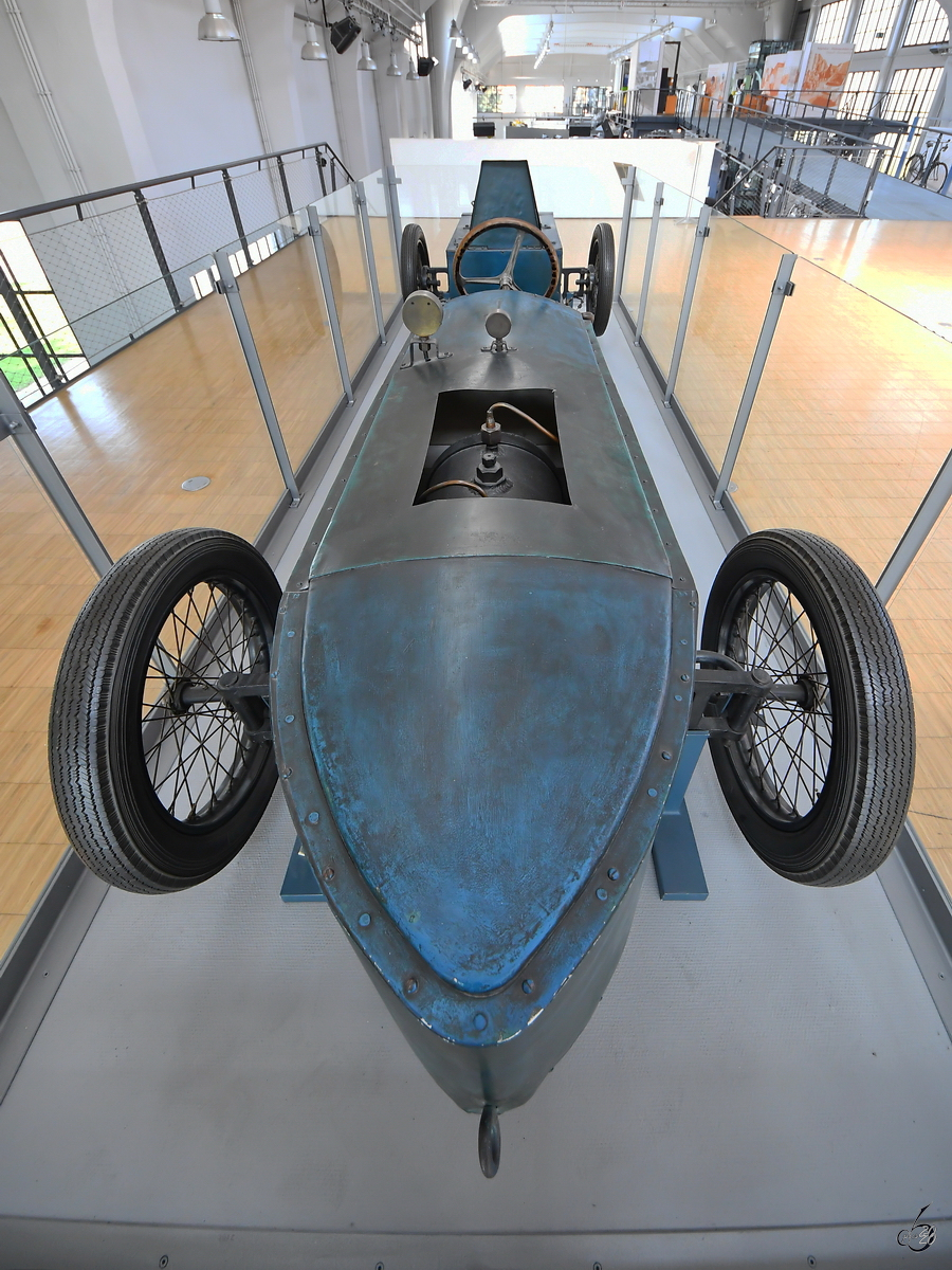 Der Valier-Heylandt Rückstoßversuchswagen Rak7 aus dem Jahr 1930 hatte einen der ersten Flüssigkeits-Raketenmotore und wurde mit Alkohol und flüssigem Sauerstoff betrieben. (Verkehrszentrum des Deutschen Museums München, August 2020)
