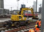 Liebherr 922 Rail Zweiwegebagger am 18.02.17 bei Bauarbeiten in Frankfurt am Main Hbf vom Bahnsteig aus fotografiert. Der Bahnsteig war gesperrt für Züge aber man durfte in betreten