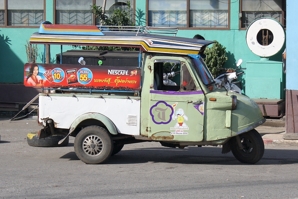Tuk Tuk vor dem Bahnhof von Trang am 25.Oktober 2010. Diese dreiraedrigen Gefaehrte werden von einem 2-Taktmotor angetrieben, der wenn man vom Gas geht, das typische "Tuk-Tuk-Tuk" Geraeusch von sich gibt, welches diesen Gefaehrten Ihren Namen gab.