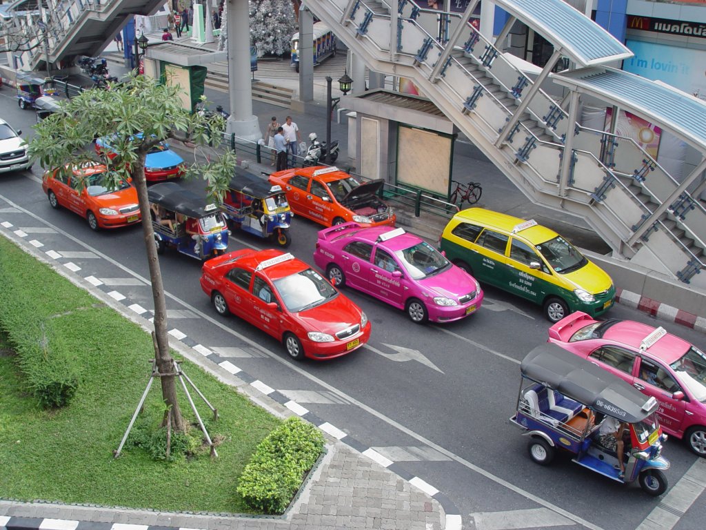 Halt bei einer Ampelanlage in Bangkok am 13.01.2011. Zu sehen sind auf dem Foto insgesamt 12 Taxen: 5 Tuk-Tuk und 7 Taxi Meter, wobei jede Taxigesellschaft eine eigene Farbe oder Farbkombination hat.