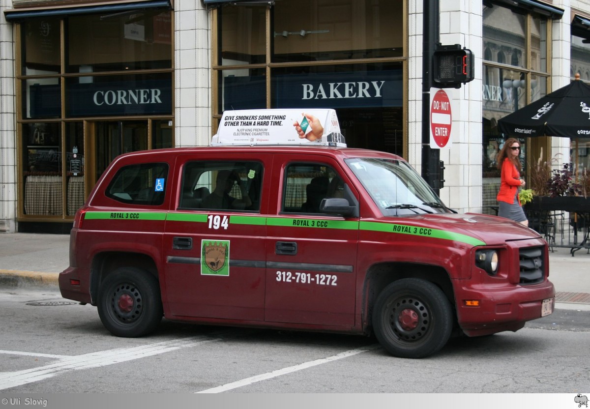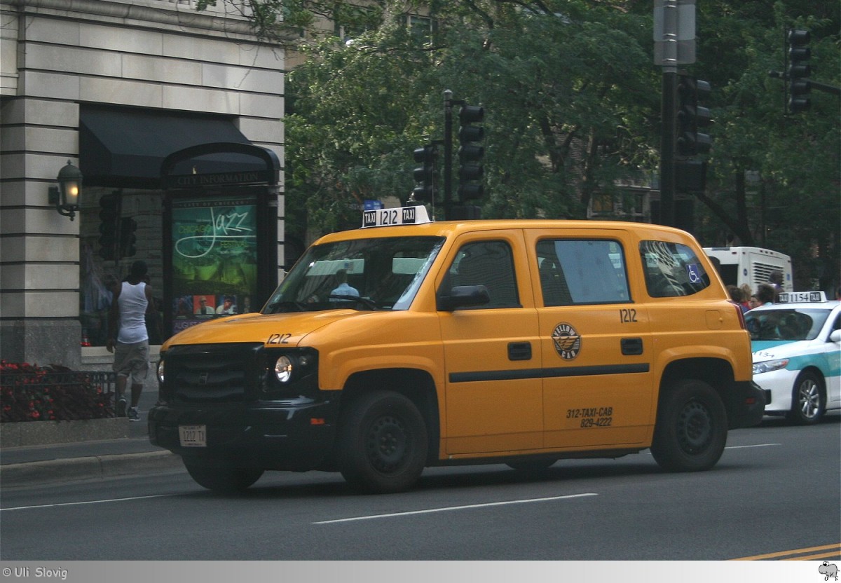 AM General / Vehicle Production Group (VPG) MV-1 Taxi der Gesellschaft "Yellow Cab", aufgenommen am 26. August 2013 in Chicago, Illinois / USA.
