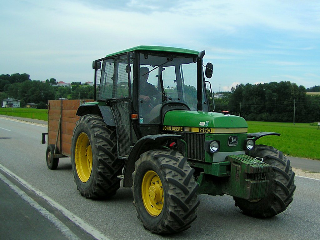 JohnDeere-1950 zieht einen kleinen Einachshänger hinter sich her;100802