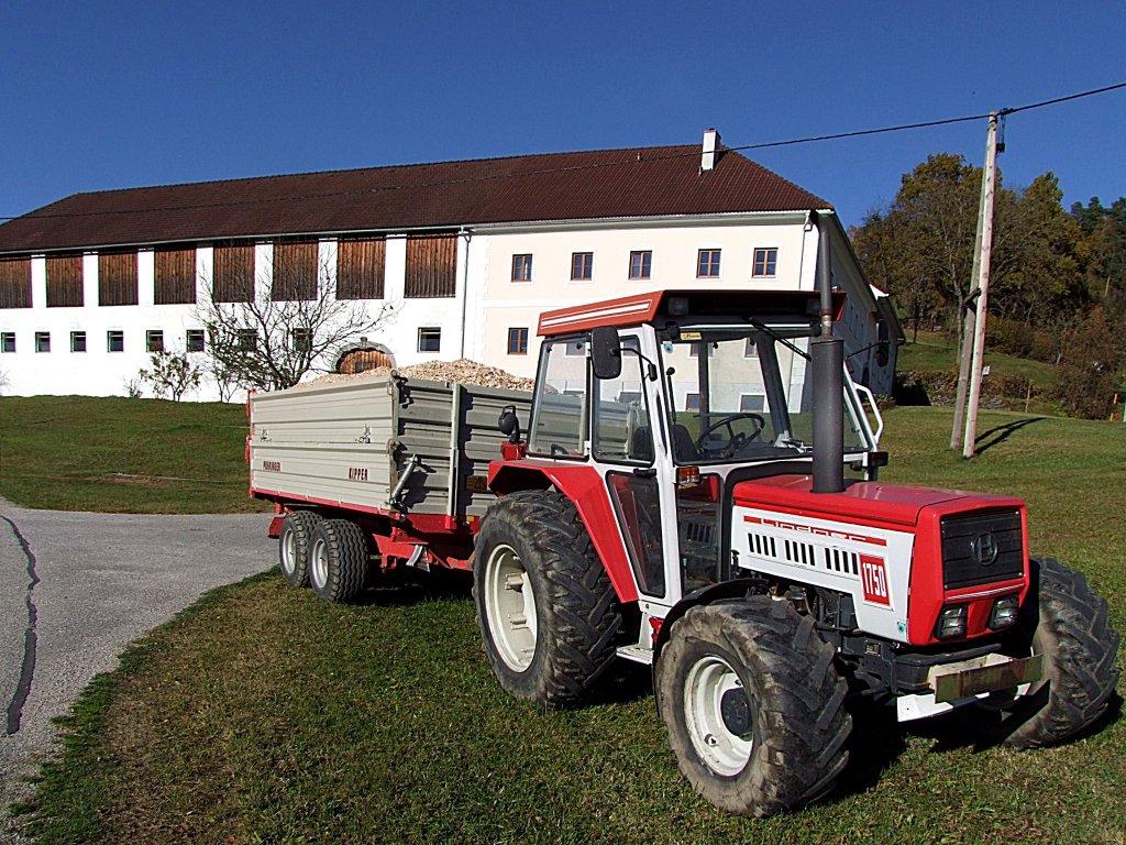 LINDNER-1750 steht mit einem Hackschnitzel beladenen Einachstandemkipper vor einem Mühlviertler Gehöft;101029