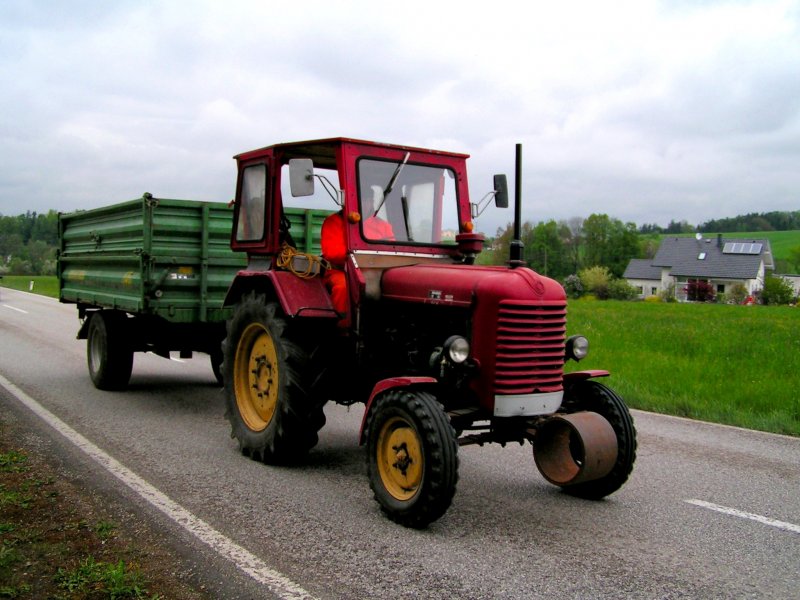 STEYR  18er  ist bei düsterem Aprilwetter mit Einachsanhänger unterwegs; 090430