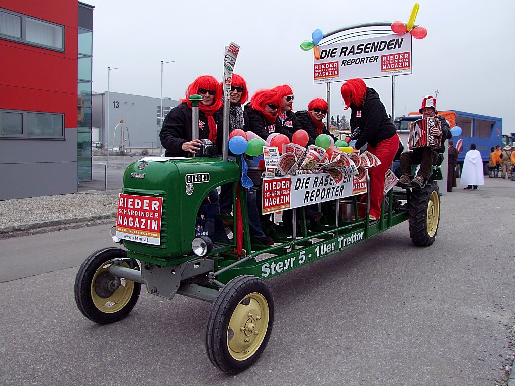 STEYR 5-10erTRETTOR(umgebauter 15er), mit welchem die rasenden Reporter einer Wochenzeitschrift beim Faschingsumzug in Ried i.I. strampelnd punkten möchten;110220