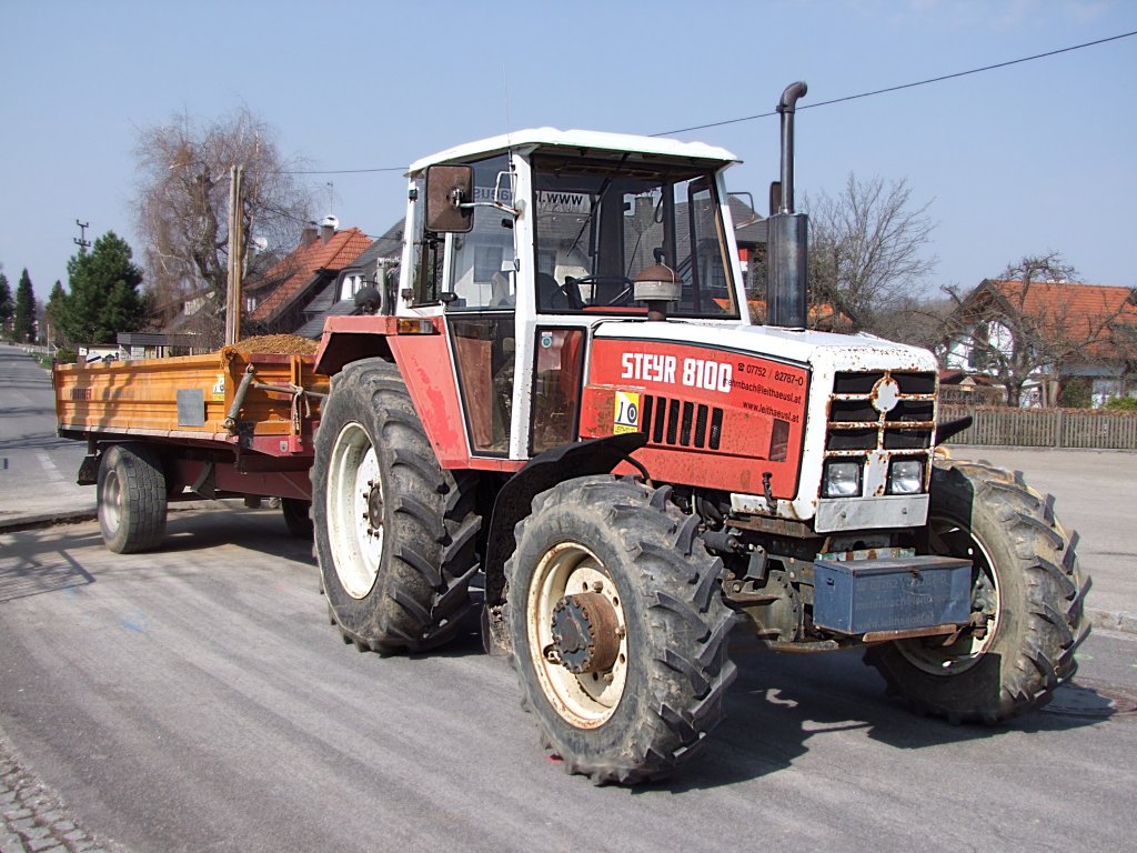STEYR 8100 hat mit dem Einachshänger eine Fuhre Schotter zu einer kleinen Straßenbaustelle herangekarrt;110330
