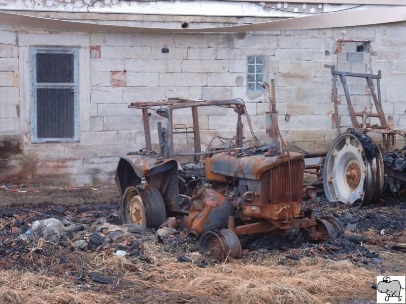Nach einen verherenden Scheunenbrand am Abend des 11 Februar 2008 im Mitwitzer Ortsteil Neundorf (Landkreis Kronach) blieb nur noch ein Skellett eines alten Traktors übrig. Es dürfte sich meines erachtens um einen John Deere - Lanz handeln. Aufgenommen wurde das Bild am 29. März 2008.