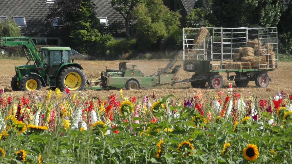 John Deere Stroherntegespann(Traktor-Ballenpresse-Sammelwagen)am 11.08.2012 in Wittlaer.Die Ballenpresse ist mit einer Ballenschleuder ausgerüstet.