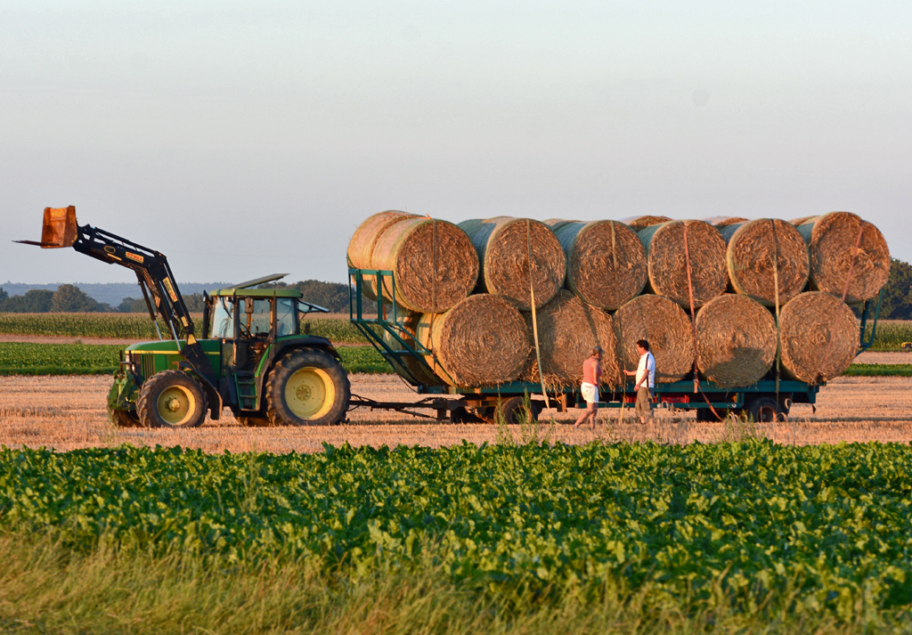 Heuballenstransport mit John Deere 6810 bei Euskirchen im Abendlicht - 16.08.2016