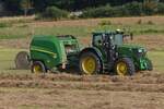 Heuernte: John Deere Traktor mit John Deere Rundballenpresse beim Aufsammeln und Pressen des Heues. 08.2024