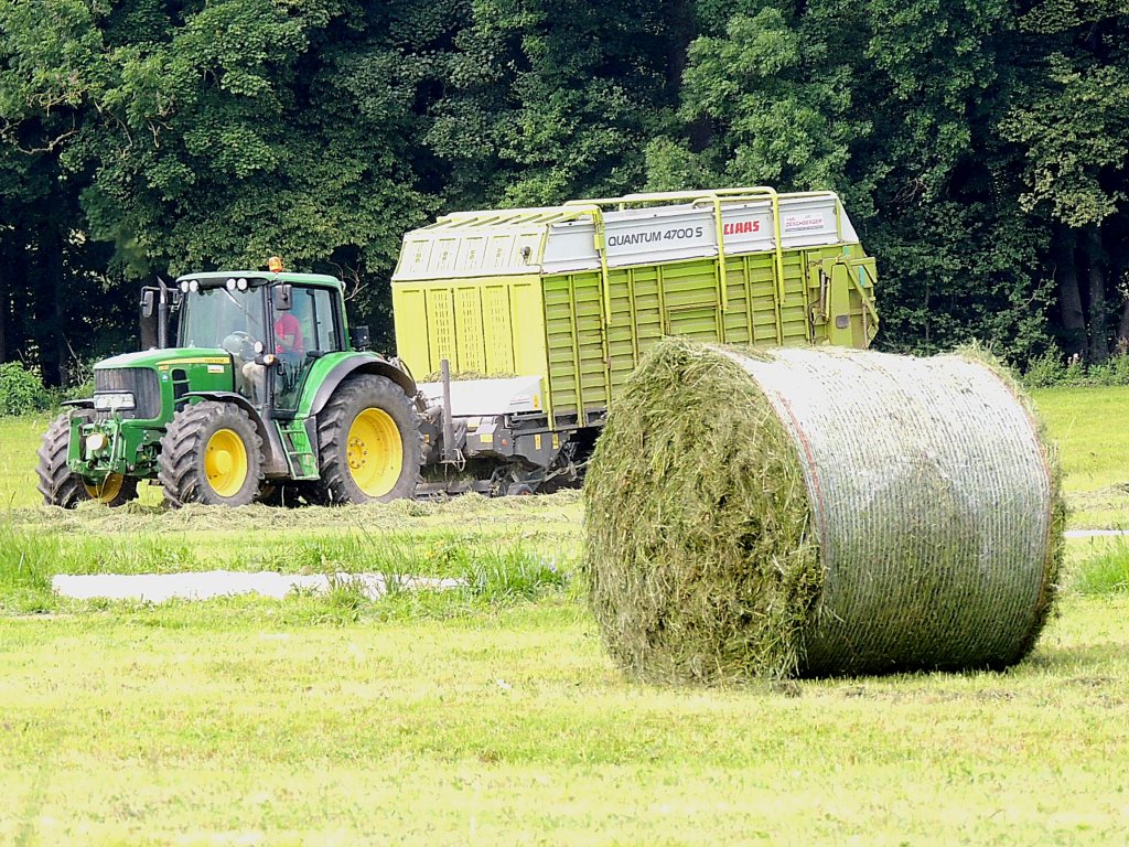 JD-6830 verrichtet mit Ladewagen CLAAS Quantum 4700S die Einbringung; 120607
