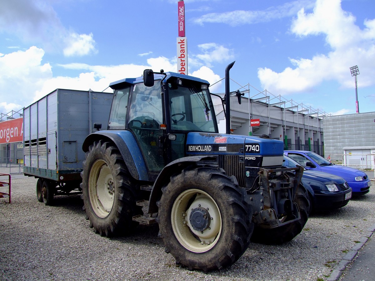 NEW-HOLLAND FORD-7740; mit kleinem Viehtransportanhänger vor der Keine-Sorgen-Arena in Ried; 140422
