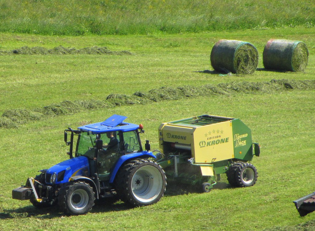 Traktor mit Ballenpresse von Krone am 26.5.2012 bei Brixlegg für Feldarbeiten.