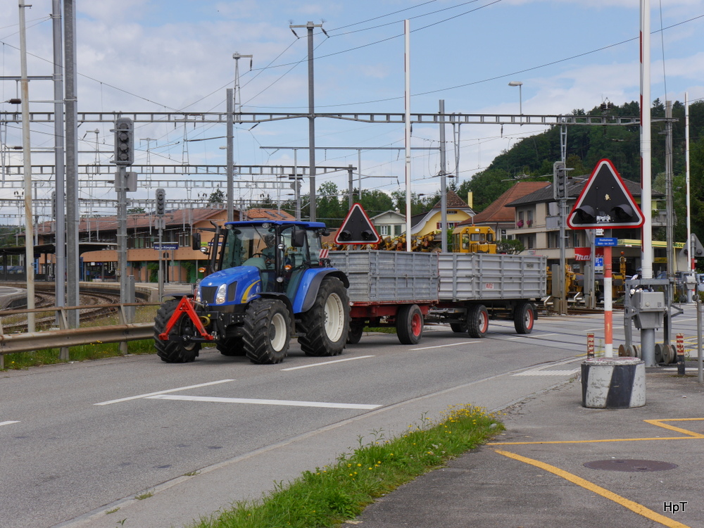 New Holland Traktor mit 2 Anhänger unterwegs bei Halse-Rüegsau am 09.08.2014