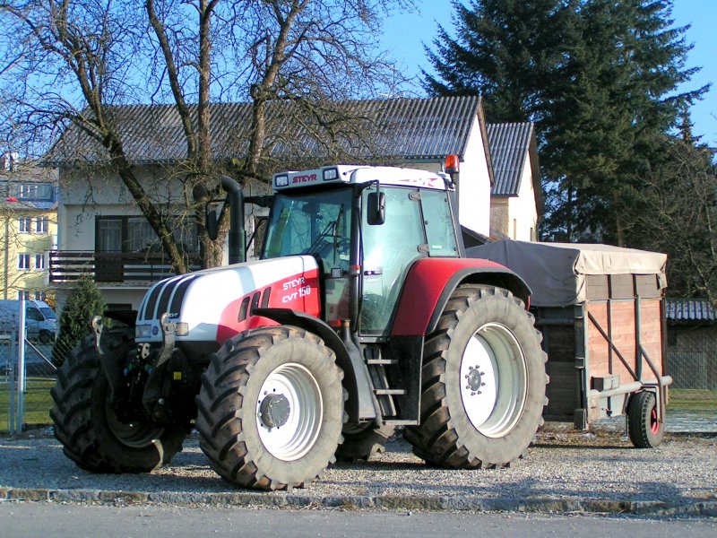 STEYR CVT150 mit einem direkt schelmenhaft wirkenden Einachshänger am Messegelände in Ried i.I.; 090113