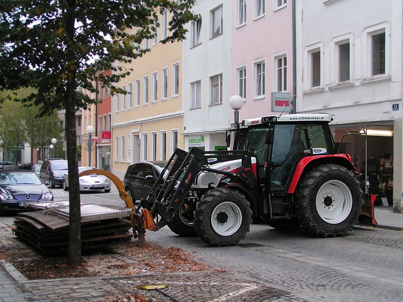 STEYR 9080M beim Abtransport von demontierten Teilen eines Schanigartens mittels angebautem Frontstapler in der Schwanthalergasse in Ried i.I.;091010