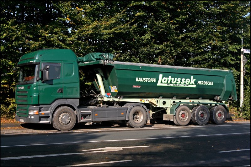 Scania R480 des Baustofftransportunternehmen Latussek aus Herdecke steht am 03.10.2008 bei Hagen auf dem Seitenstreifen. Latussek verwendet neben Scania R480 auch MAN TGA 18.430 und Volvo´s.